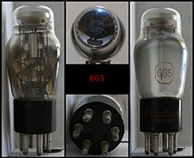 In U.S. made radios, the first type issued was the type 6E5 single pie shaped image, introduced by RCA and used in their 1936 line of radios. Other radio makers used the 6E5 as well until, soon after, the less sensitive type 6G5 was introduced. Also, a type 6AB5 aka 6N5 tube with lower plate voltage was introduced for series filament radios. Type number 6U5 was similar to the 6G5 but had a straight glass envelope. Zenith Radio used a type 6T5 in their 1938 model year radios with "Target tuning" indicator (resembling a camera iris), but was abandoned after a year, with Ken-Rad manufacturing a replacement type. All these types use a 6-pin base with two larger pins for filament connection.